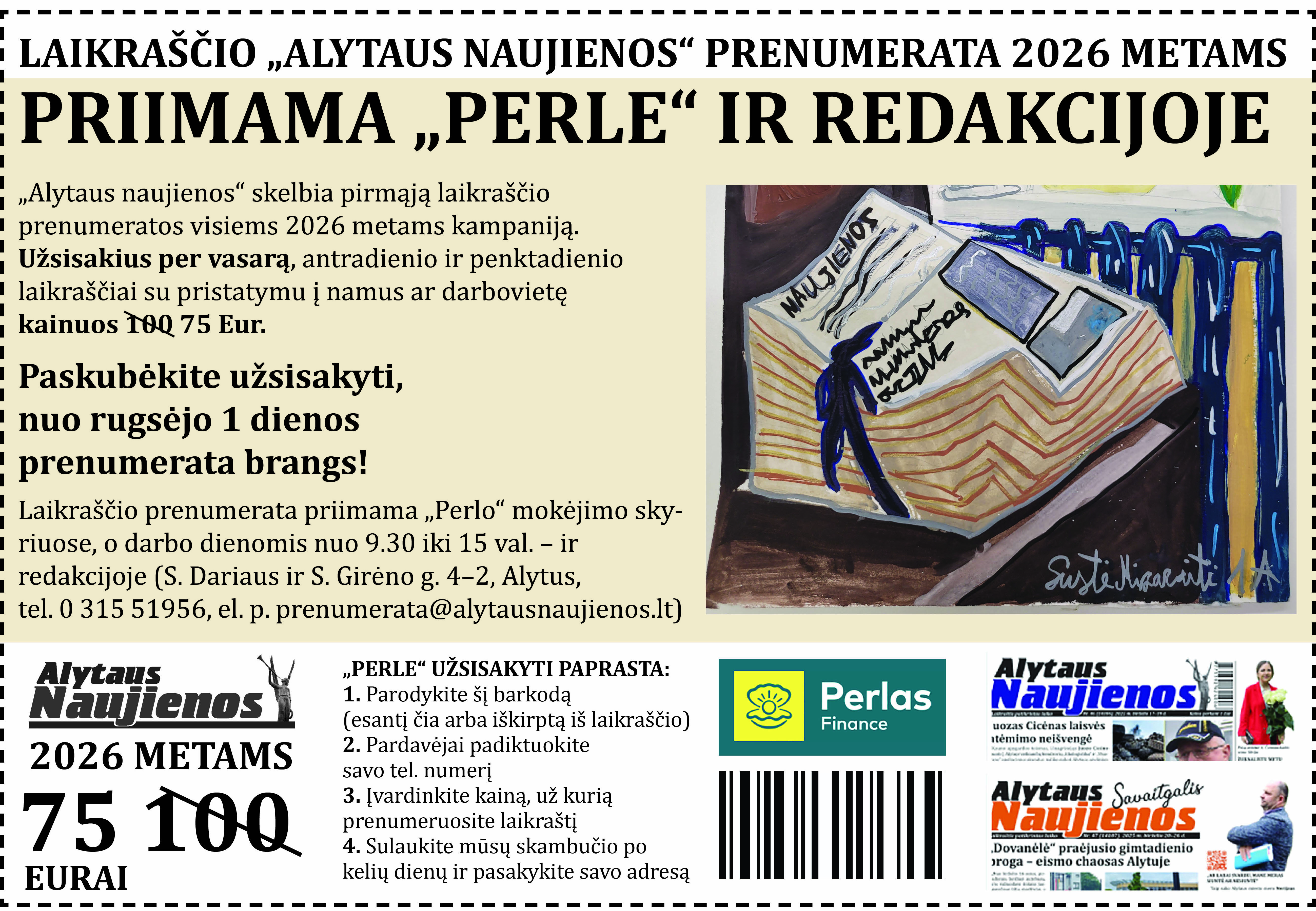 Pigiausias būdas skaityti – laikraštį užsisakyti ir jį antradieniais bei penktadieniais gauti į namus ar darbą. Užsiprenumeruoti galite jums patogiu metu „Perlo“ mokėjimo skyriuose arba darbo dienomis iki 15 val. mūsų redakcijoje (S. Dariaus ir S. Girėno g. 4-2, Alytus, tel. 0 315 51956).