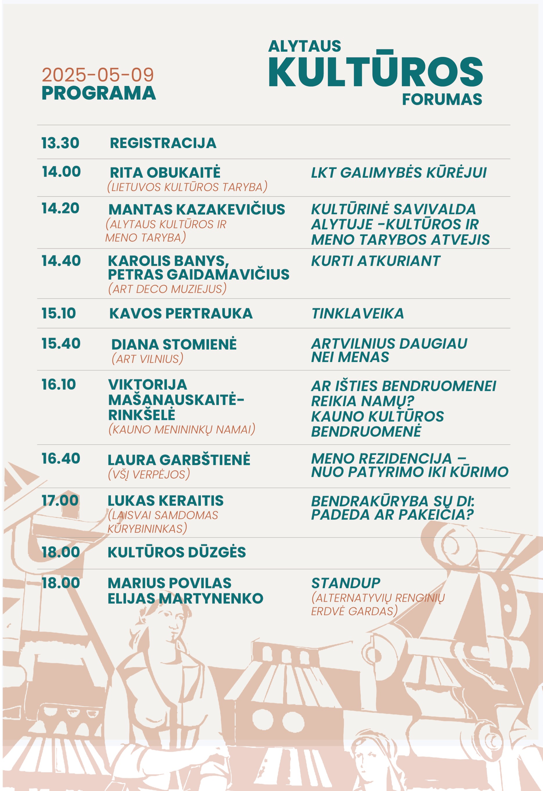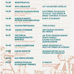 Iš Kauno menininkų namų atvykstanti Viktorija Mašanauskė-Rinkšelė papasakos, kodėl menininkams vis dėl to reikia namų ir kaip regionai galėtų prisidėti juos steigiant. Nepriklausomos meno iniciatyvos „Verpėjos“ įkūrėja Laura Garbštienė dalinsis patirtimi, kaip nuo patyrimo iki įgyvendinimo įkurti meno rezidenciją, o pranešimų sesiją užbaigs laisvai samdomas kūrybininkas, dirbtinio intelekto (DI) specialistas Lukas Keraitis, kuris kvies garsiai pasvarstyti „Bendrakūryba su DI: padeda ar pakeičia?“.