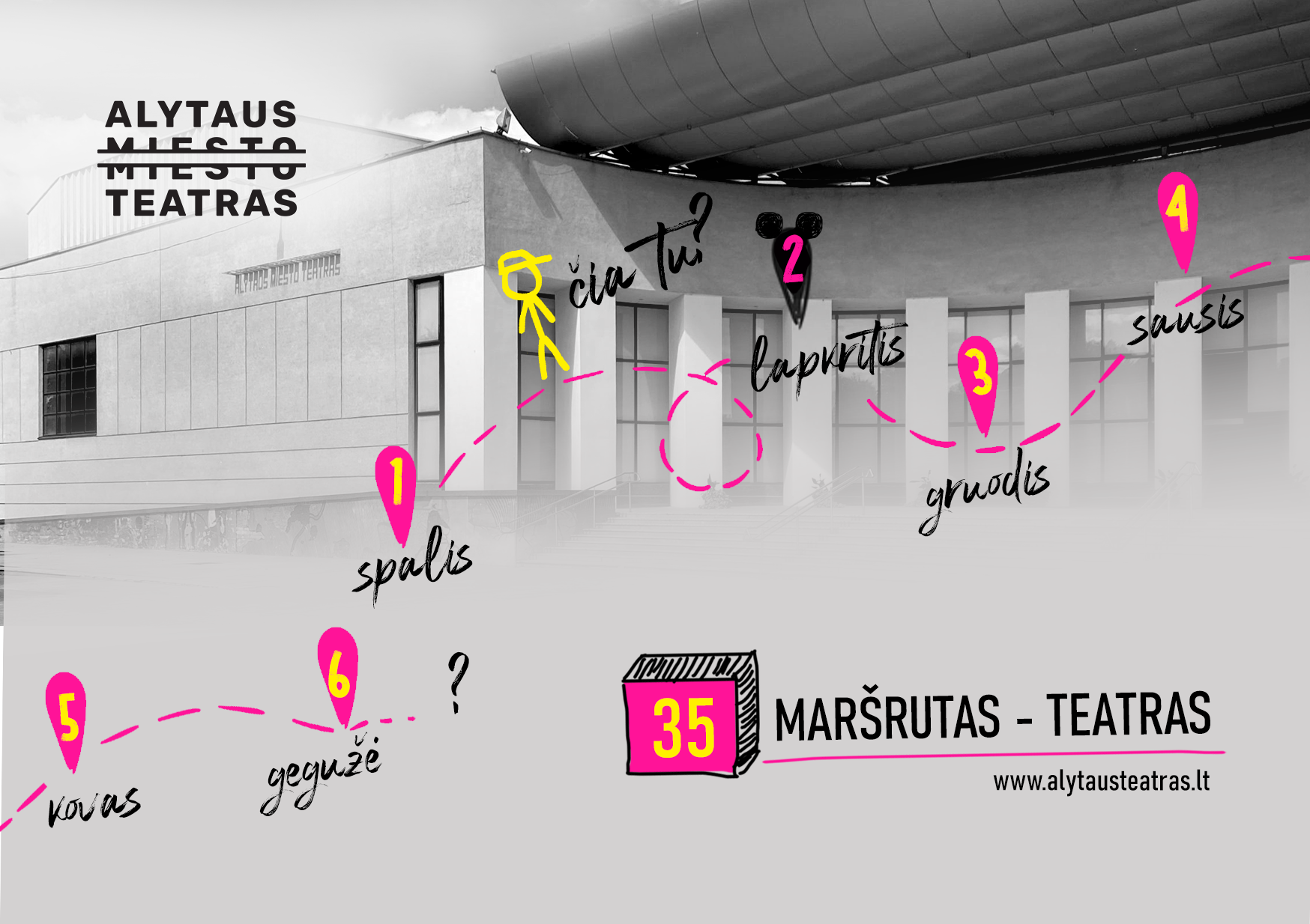 Kiekviena diena, kiekviena valanda ir net minutė prasideda vis nauju maršrutu. Mes nuolatos kuriame savo maršrutus – į darbą, į mokyklą ar ten, kur tiesiog gera ar jauku. Jau trečiadienį Jus kviečiame pasirinkti naują maršrutą – į Teatrą. Tikrai taip, galime pelnytai didžiuotis, jog Alytaus miesto teatras pradeda 35-ąjį sezoną su šūkiu „Maršrutas – Teatras“!