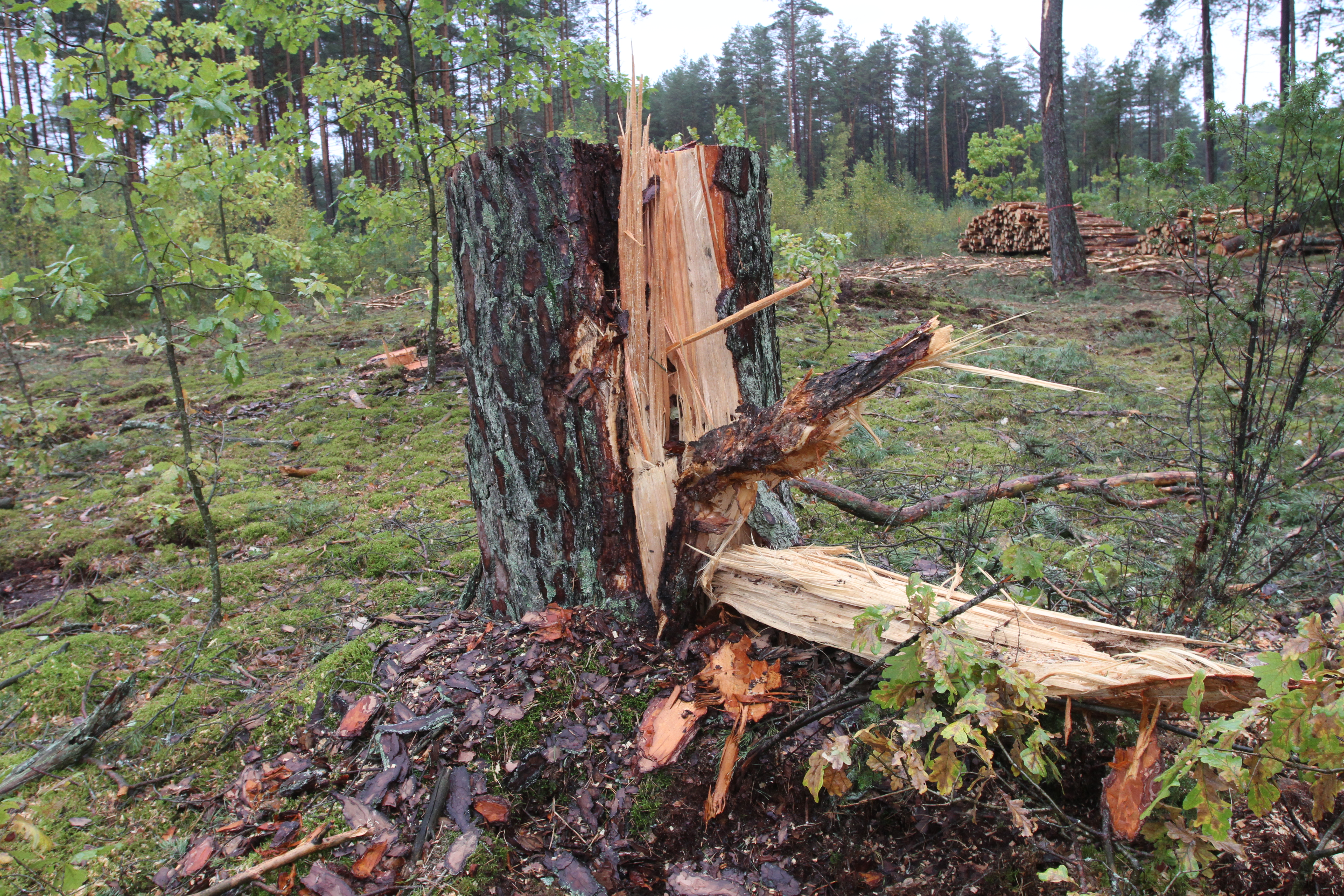 G.Sventickas tvirtino nematantis tragedijos dėl dabar kirtavietėje paliktų kelių aukštų kelmų, – leidimas galioja iki metų pabaigos, iki to laiko turi būti sutvarkyta kirtavietė. Pasak poskyrio vedėjo, negali būti nuogąstavimų dėl viduryje kirtavietės atseit paslėptų medžių kelmų, juk leidimas duotas plynam kirtimui. Dirbo stambiagabaritė medžių kirtimo mašina, mediena traukta traktoriumi, turinčiu plačias padangas. Pasak G.Sventicko, visiškai tikėtina, kad tokiai technikai besisukinėjant, dalis žemės ir samanų nukrinta ant nukirstų medžių kelmų.