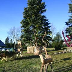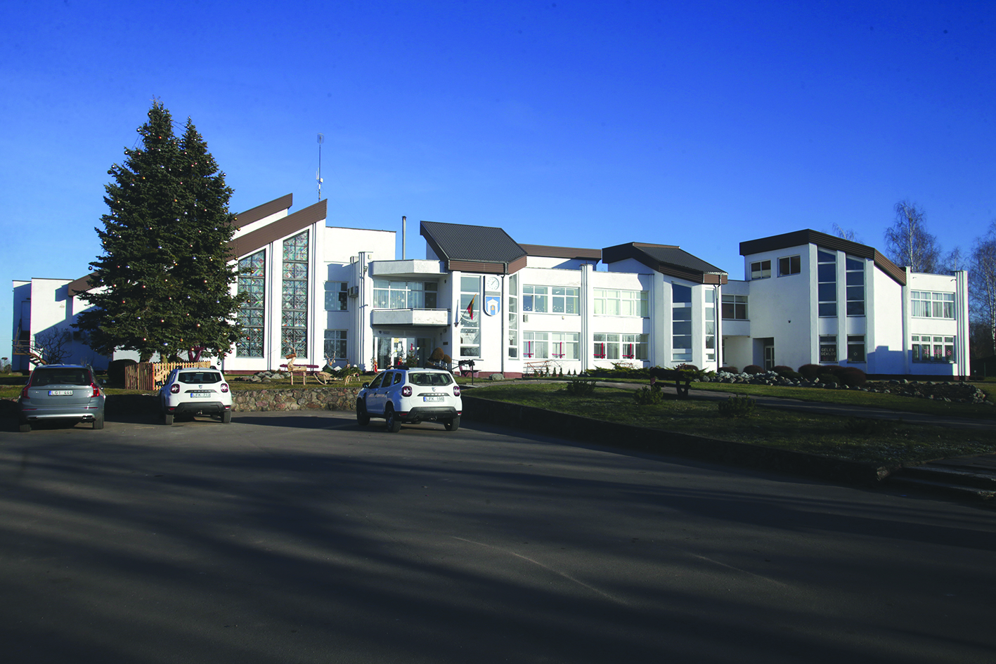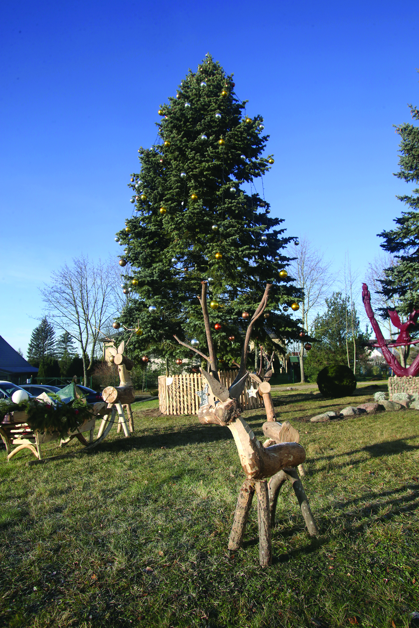 Su spindinčiais žaisliukais ir šviečiančiomis girliandomis ji pasitinka ir šįmet. O šalia jos – ir šventinės, dovanų pilnos rogės, elniukai ir briedžiukai. Visa tai pagamino kūrybinių sugebėjimų turintis Petras Radiškevičius iš Miroslavo seniūnijos, Obelijos kaimo.